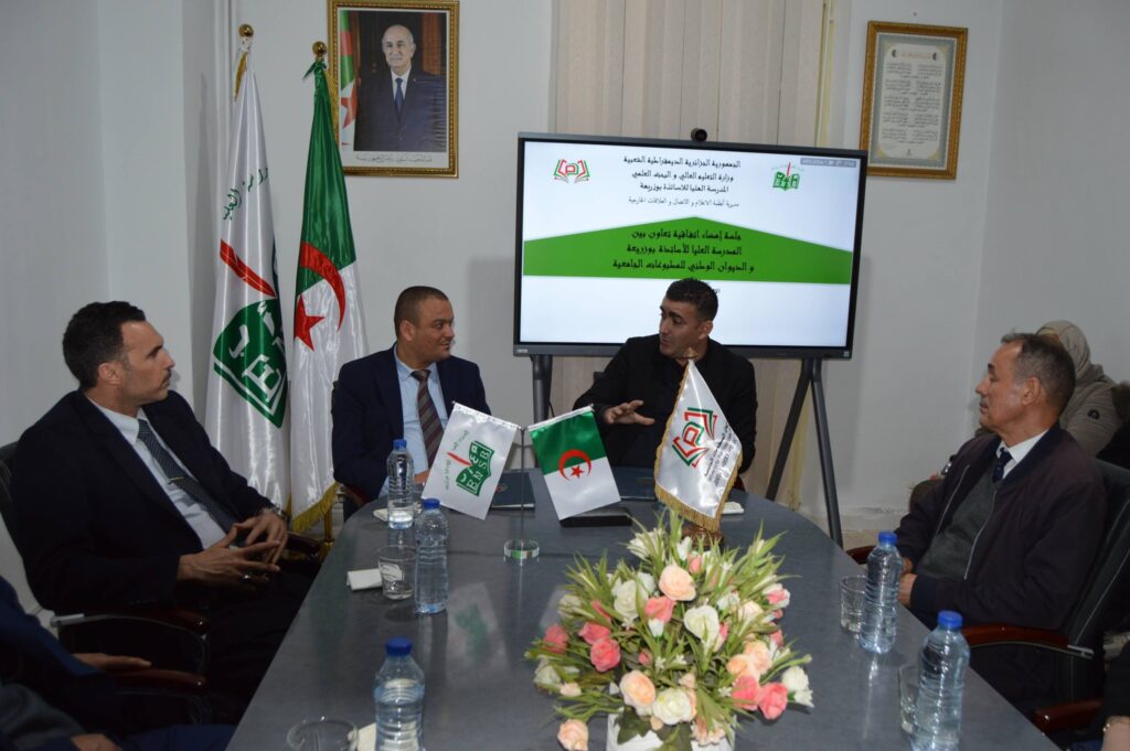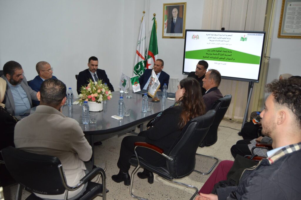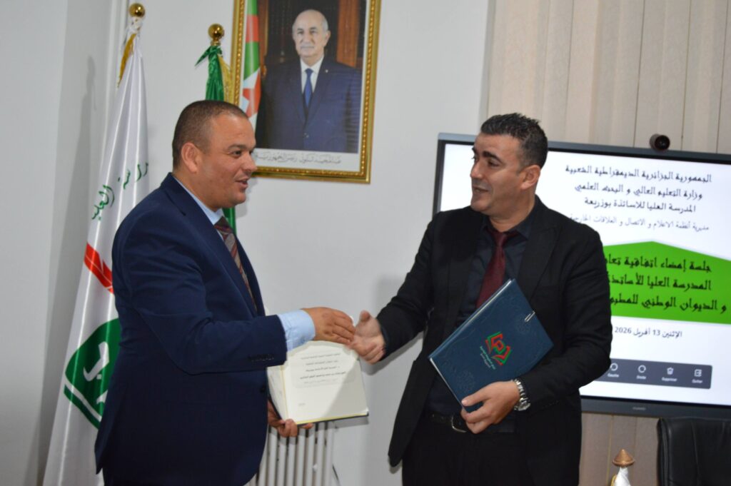 On the evening of Monday 12 April 2026, in the meeting room, a partnership and cooperation agreement was signed between the Higher School of Teachers in Bouzareah, represented by Dr Mohamed Abdelmoneim Bresh, Director of the School, and the National Office for University Publications, represented by Mr Zine El Abidine Boumlit.