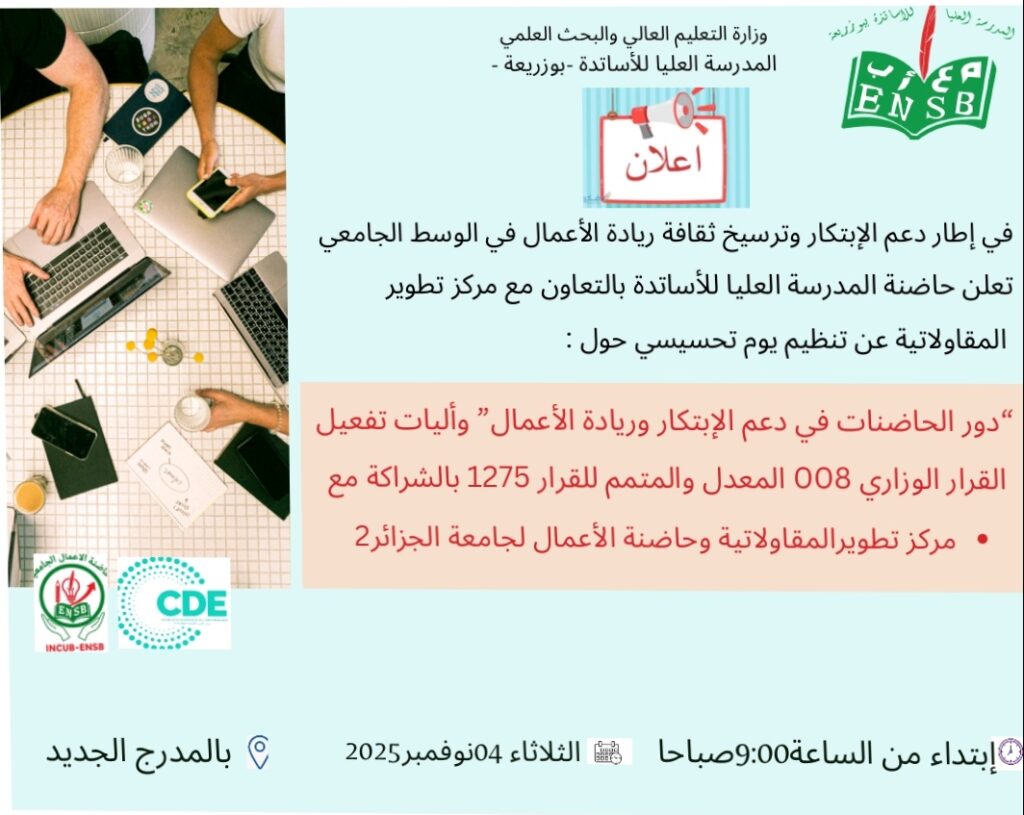 إعلان عن الاستشارة رقم 017/م ع أ ب /2025 و المتعلقة باقتناء تجهيزات لحاضنة المدرسة العليا للأساتذة بوزريعة